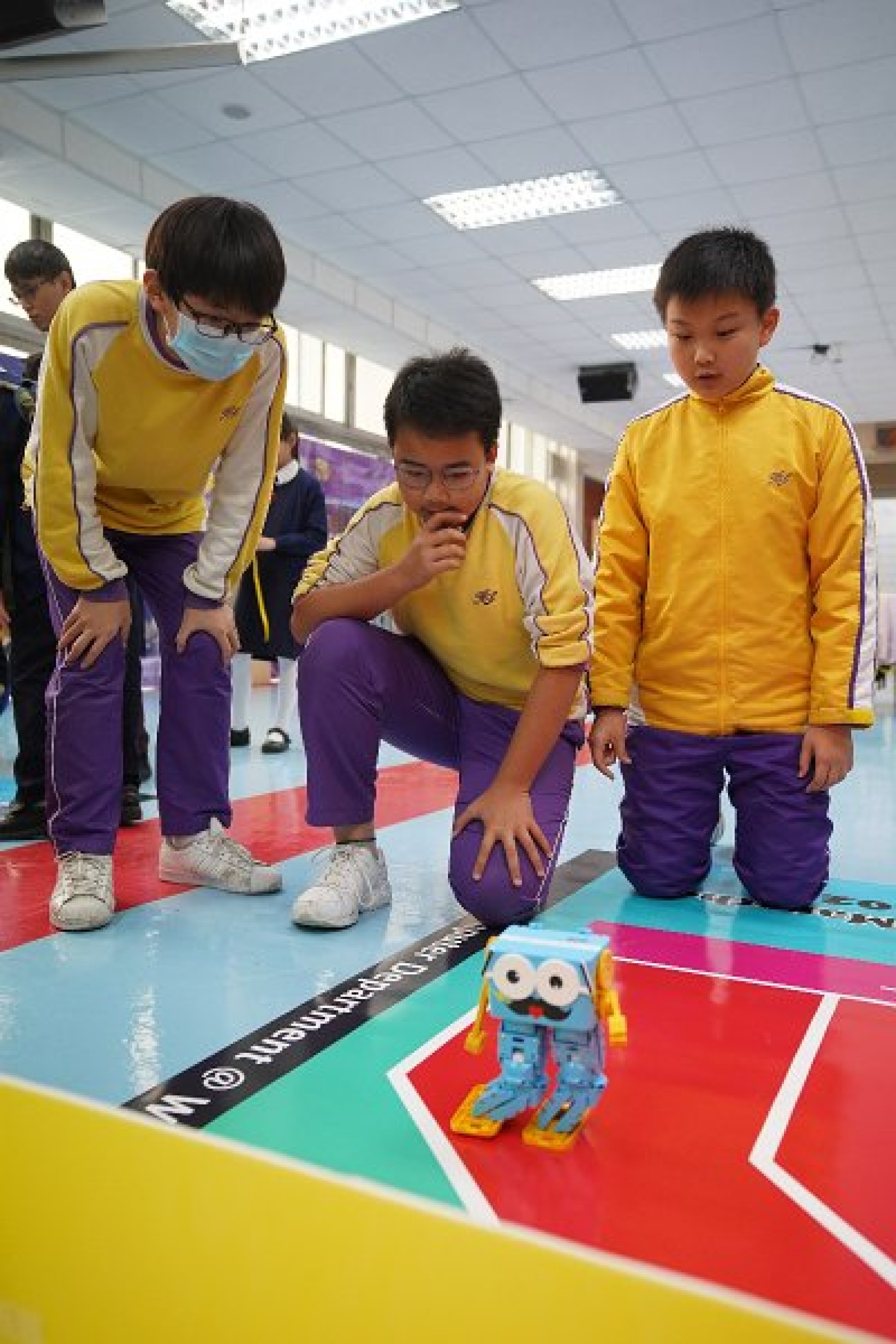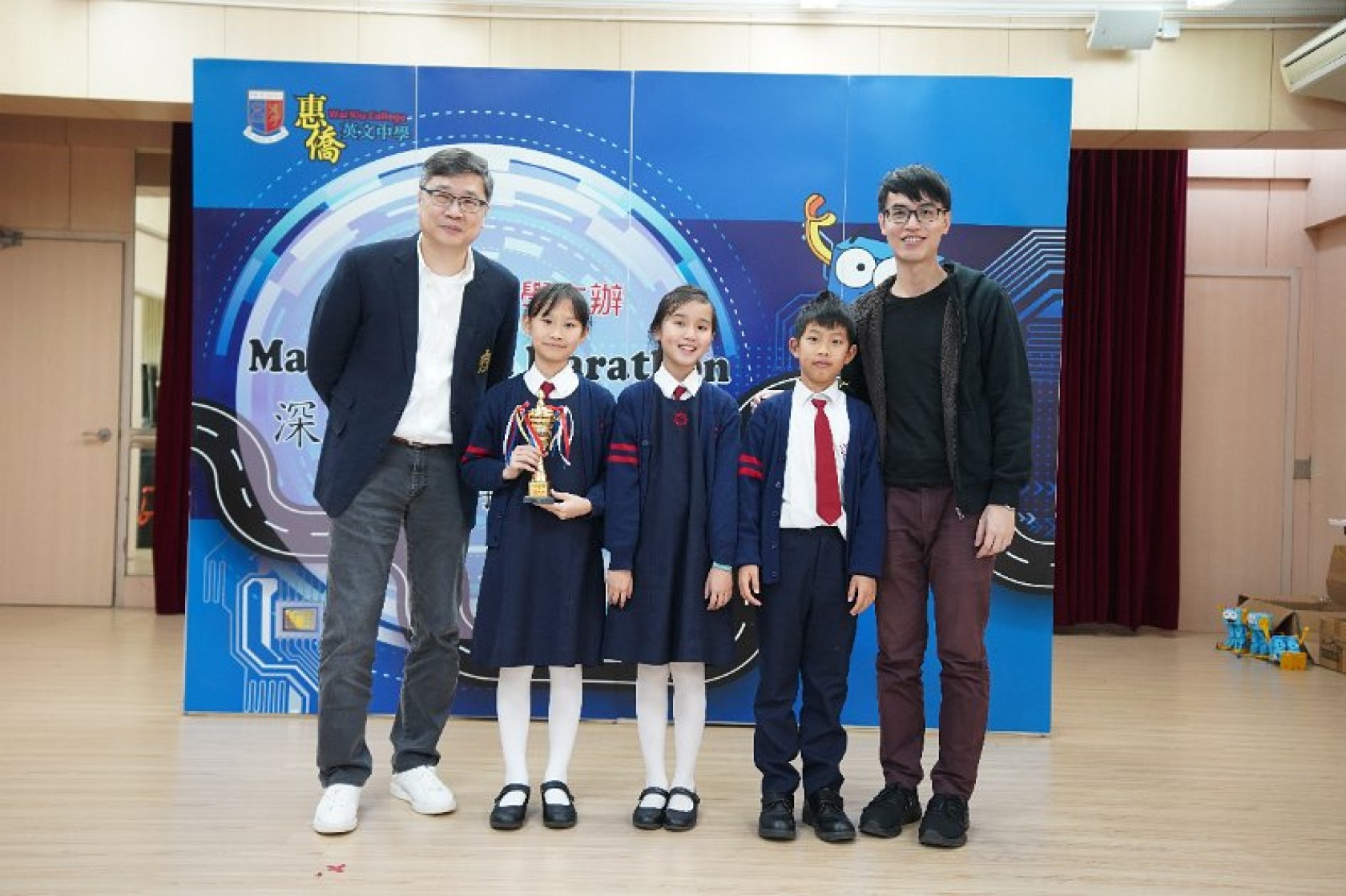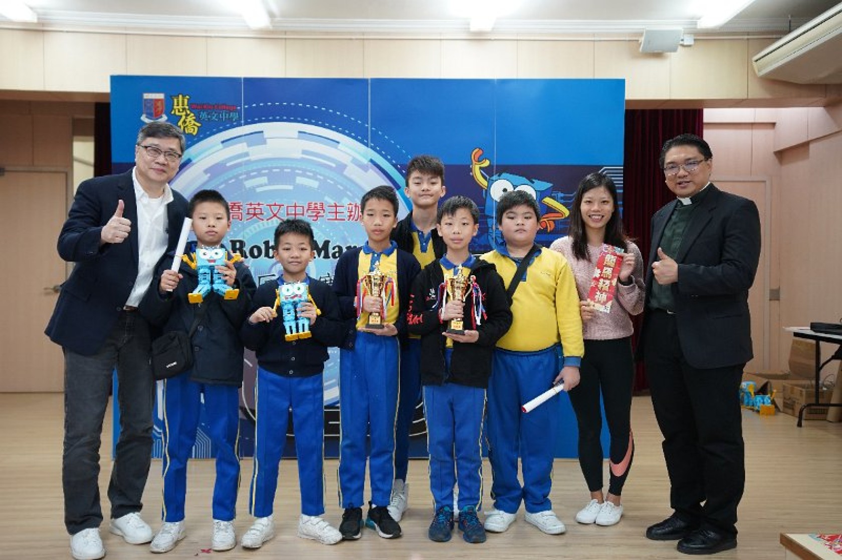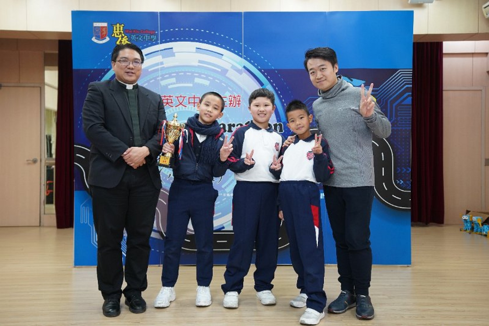 Marty Robot Marathon 深水埗區區賽2020(小學組)經已完滿落幕。是次比賽由惠僑英文中學主辦,亦是首間學校引入迷你步行機器人“Marty the Robot”至香港教育界別作比賽。當日多間小學約六十位學生蒞臨參賽,比賽共設兩部份,以關卡難題形式的比賽賽道考驗學生即時的編程能力及解難能力,相當具挑戰性! 各隊伍的成員齊集一堂,氣氛非常緊張熱烈。比賽是一個集合直線及不同角度的斜道、障礙物及迷宮賽道,以機械人能步行至最遠距離的隊伍為冠軍,主要考驗小學生的編程知識及即時的應變及解難能力。在當日早上公開賽道後,13隊參賽隊伍均有測試及比賽時段,各隊伍把握每分每秒去測試賽道,場面非緊張刺激。 比賽結束後隨即進行頒獎,各小學的得獎的學生都獲得獎狀與獎盃作為鼓勵。
