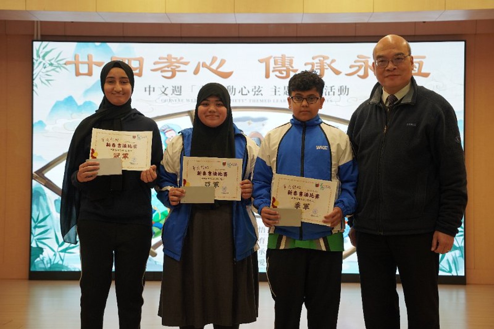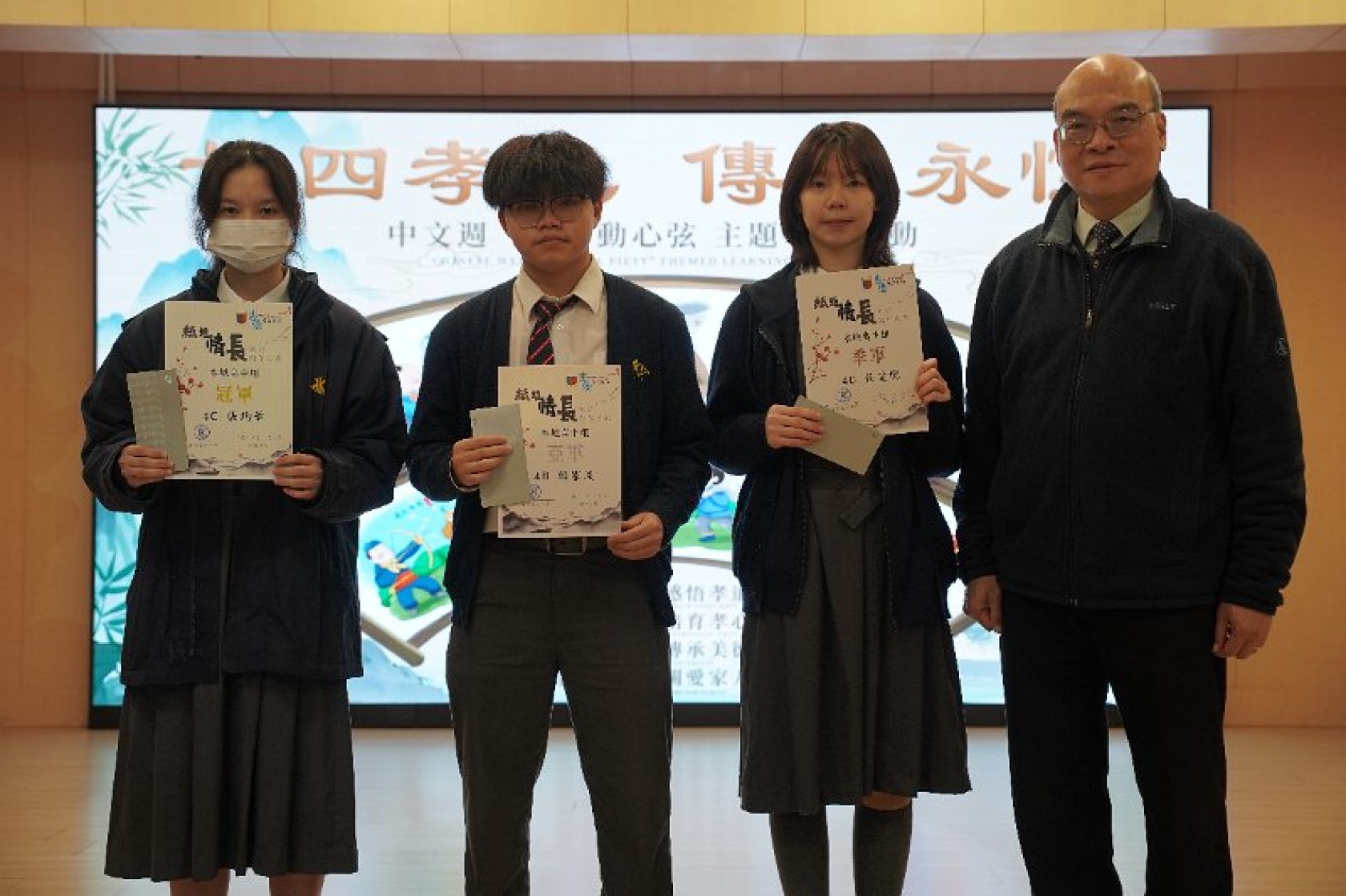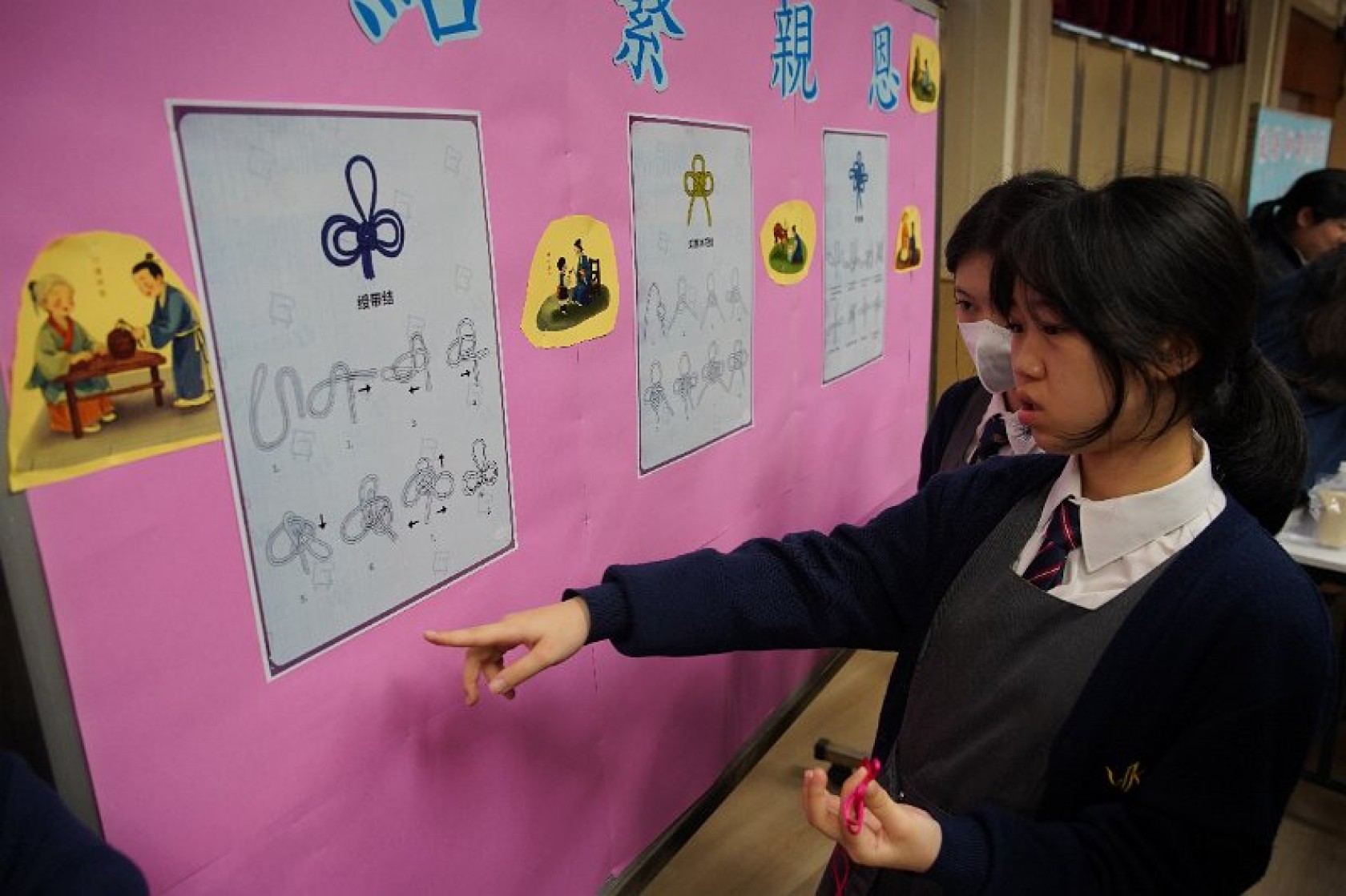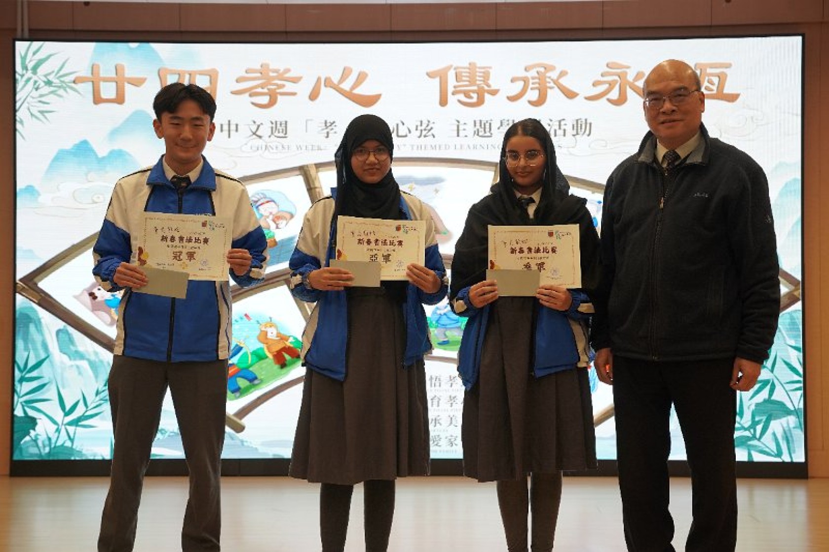 本年度中文週以「廿四孝心、傳承永恆」為主題,透過多元活動,深化學生對孝道價值觀的理解與實踐,並促進非華語學生與華語學生共融。課堂講授二十四孝故事,學生領略孝道文化精髓;「紙短情長」短詩創作比賽中,學生以詩寄情,字字珠璣,抒發對父母的感恩之心。週四午膳期間更舉行孝道文化知識攤位遊戲,例如「二十四孝故事對對碰」、「成語知識」、「孝言孝語大配對」,當中「結繫親恩」最受歡迎,學生親手編織中國結,贈予長輩,以物傳情,孝道精神內化於心。週五早會上,非華語中華文化大使分享巴基斯坦等國家的孝道精神,此外,大使們更自編自導自演,以生動的影片形式傳揚孝道,將傳統美德融入生活。活動中,非華語學生與華語學生共同參與,互相交流,增進理解,促進文化共融。活動豐富多彩,寓教於樂,學生於知、情、意、行四方面皆有所得,孝道價值觀深植心田,傳統文化薪火相傳,成效斐然。