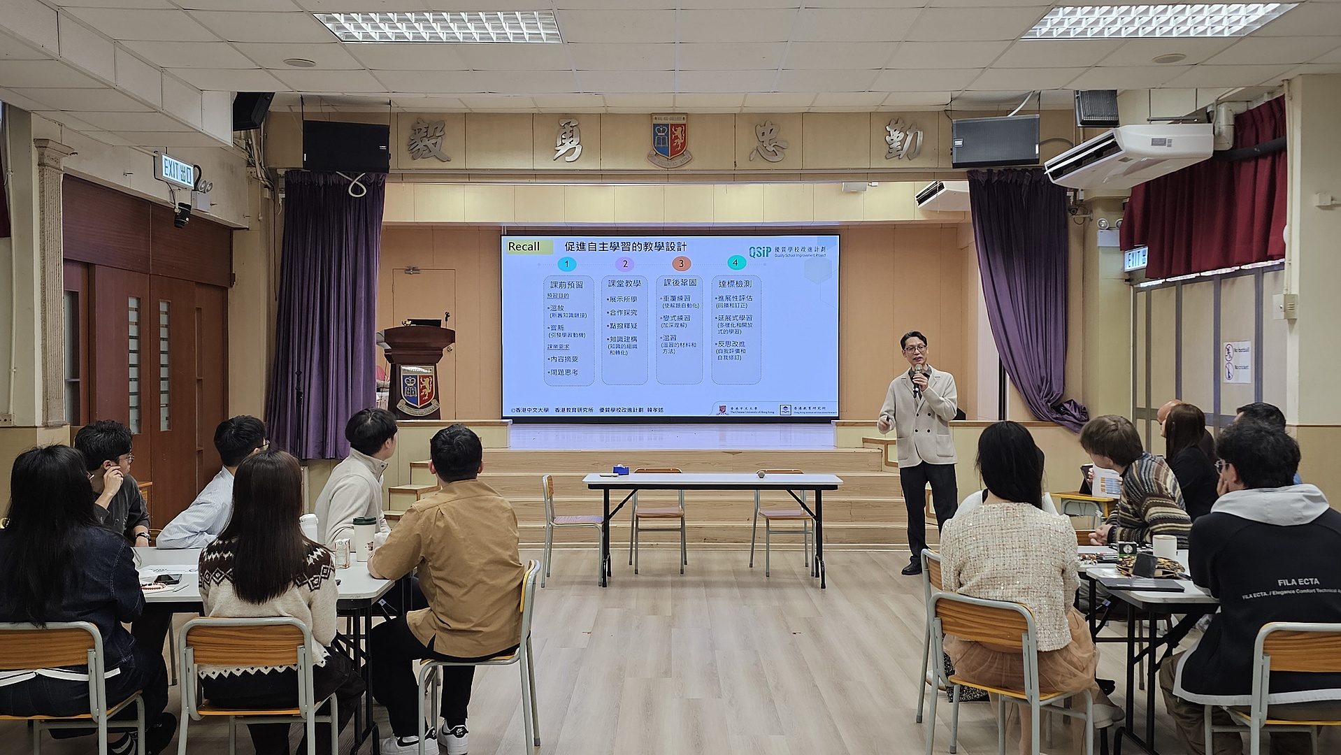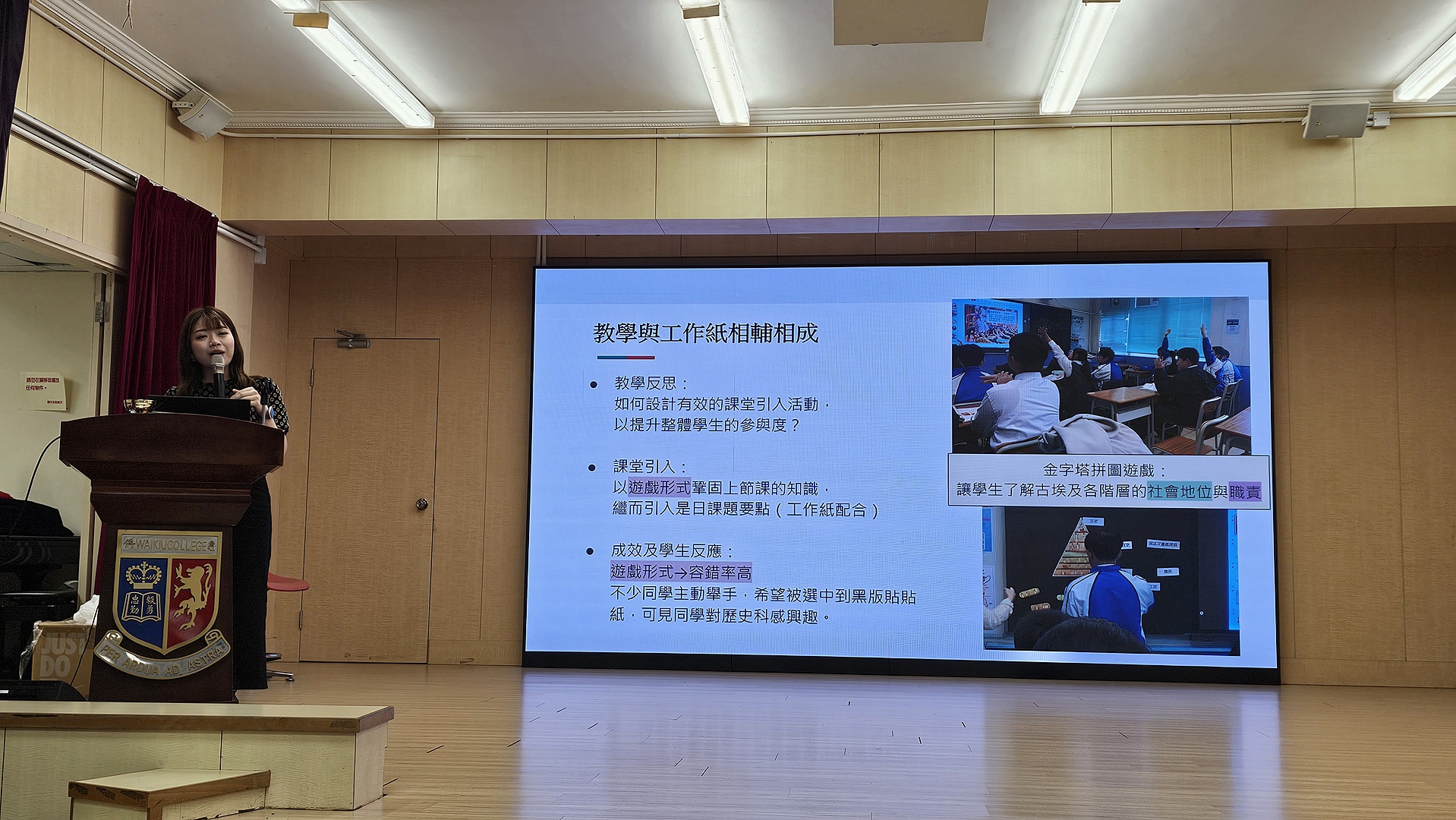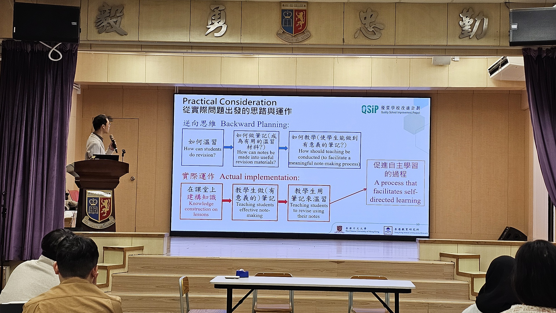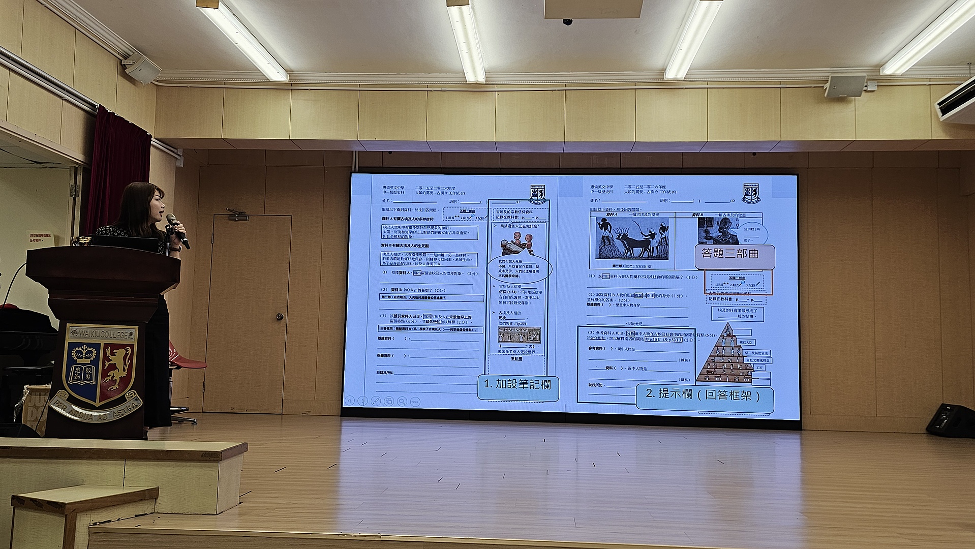 是次發展日分為兩部份。首先是優質學校改進計劃,透過「校本專業支援」推動學校繼續改進自主學習的製作筆記技巧。當中有中文、數學、歷史及科學科的分享,使不同範疇的老師均有所獲。之後就是第二部份,有關非華語學生的升學講座。承蒙教育局支持,香港明愛青少年及社區服務為多所學校的非華語中學生提供升學及就業輔導。當天,他們為我校教師作專業交流,簡介計劃內容及介紹非華語同學的升學路徑。