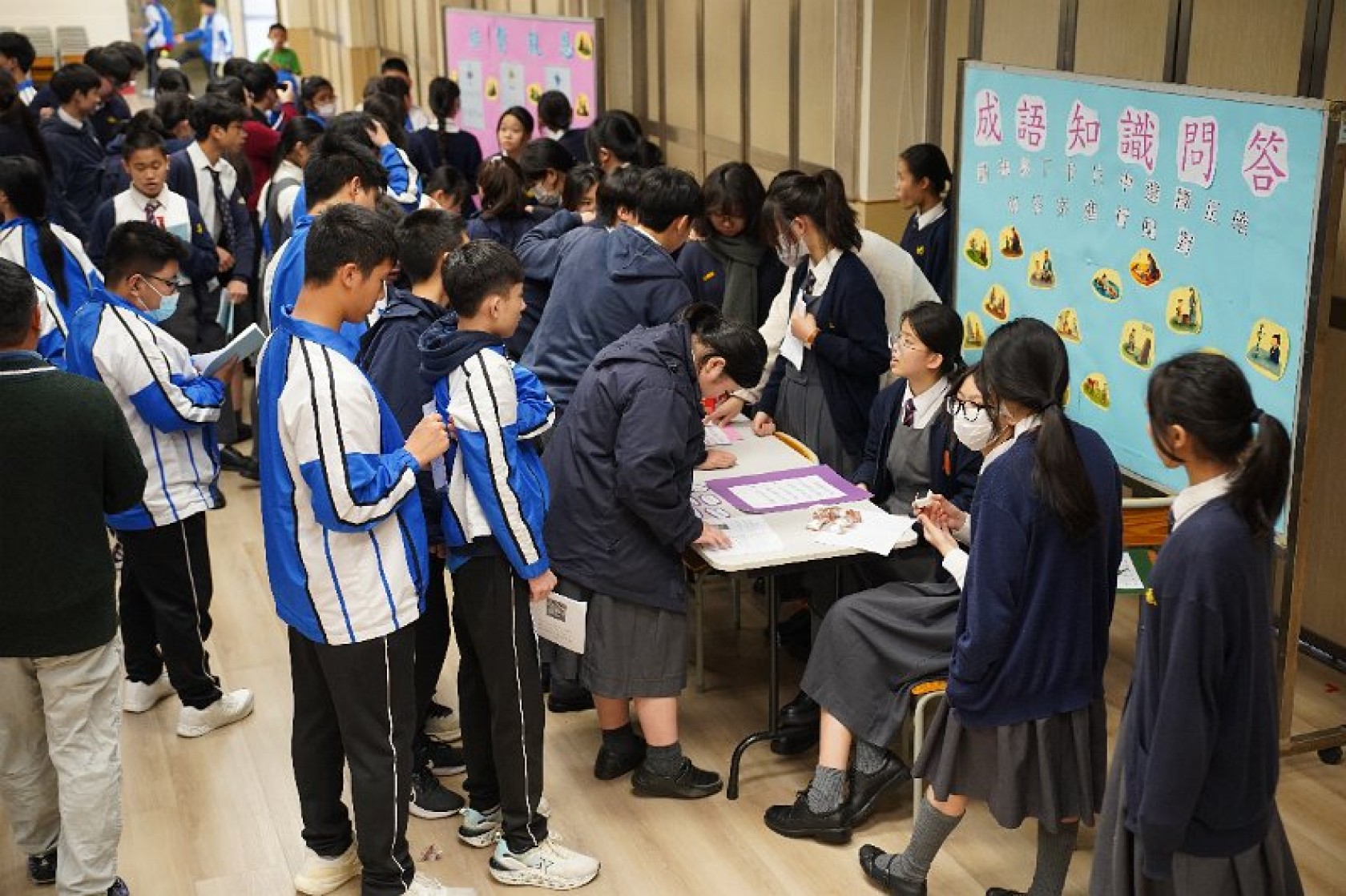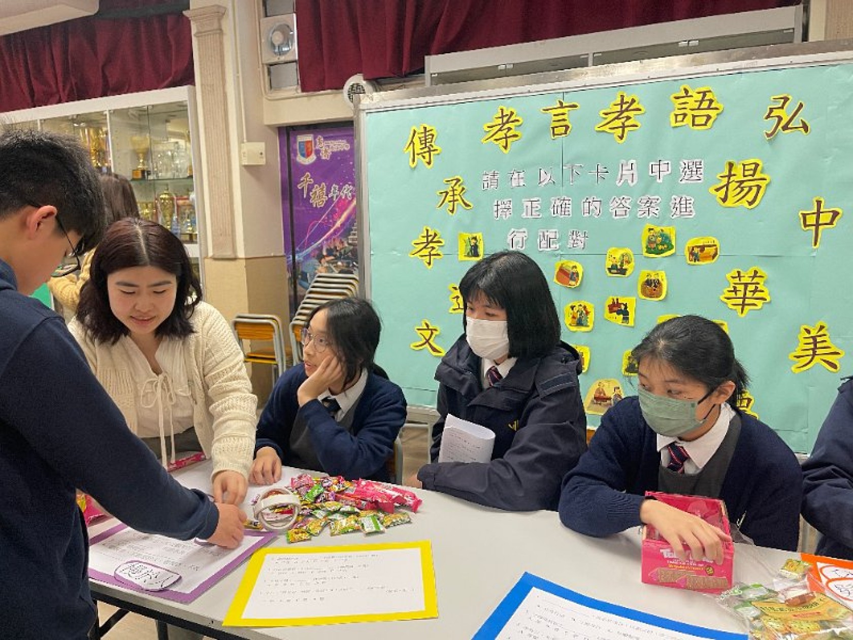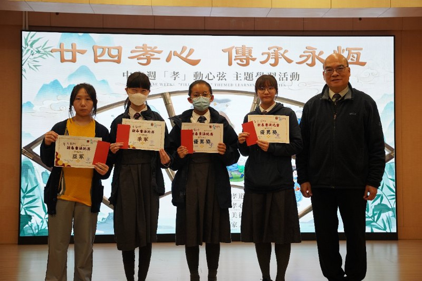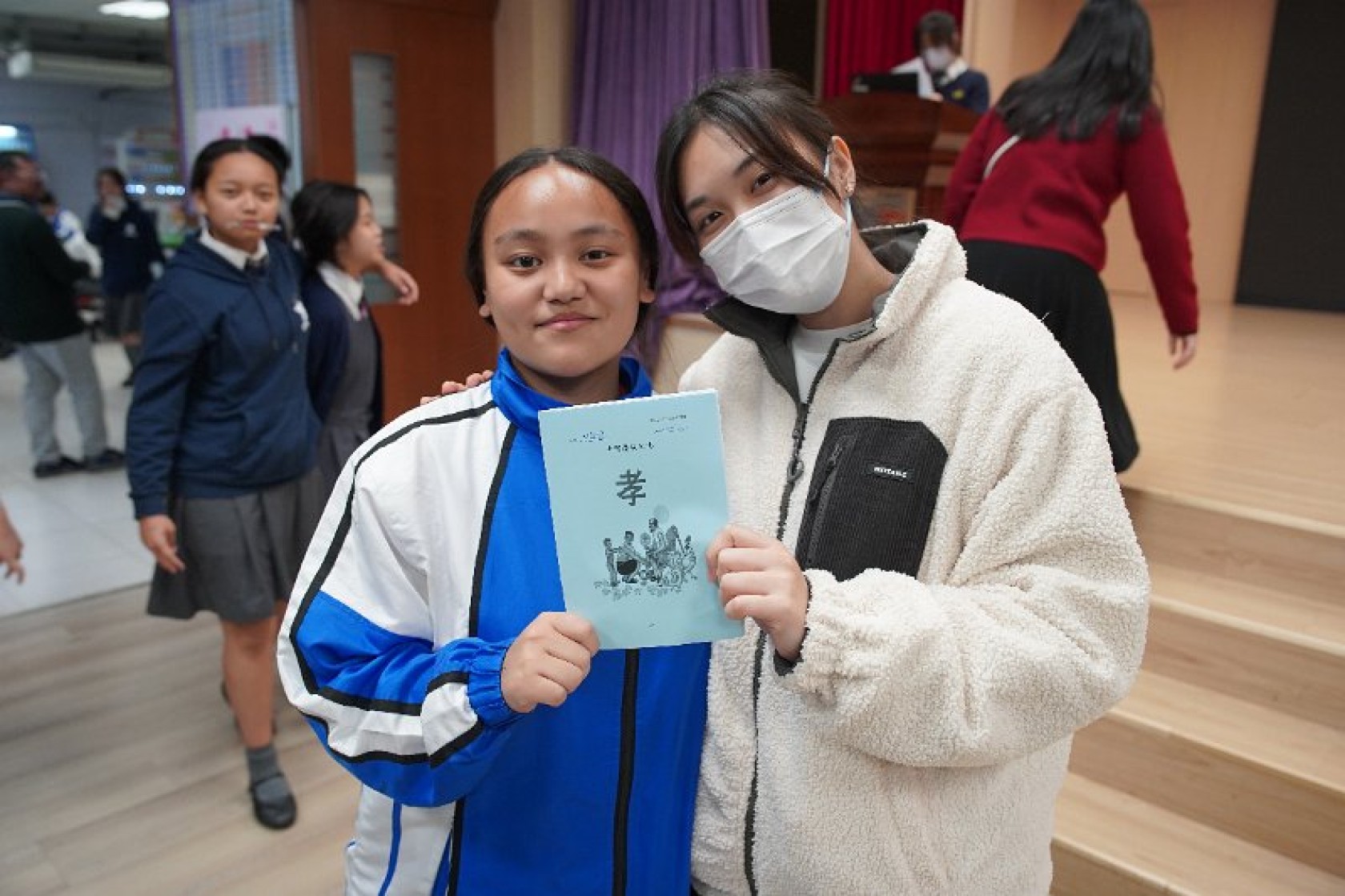 本年度中文週以「廿四孝心、傳承永恆」為主題,透過多元活動,深化學生對孝道價值觀的理解與實踐,並促進非華語學生與華語學生共融。課堂講授二十四孝故事,學生領略孝道文化精髓;「紙短情長」短詩創作比賽中,學生以詩寄情,字字珠璣,抒發對父母的感恩之心。週四午膳期間更舉行孝道文化知識攤位遊戲,例如「二十四孝故事對對碰」、「成語知識」、「孝言孝語大配對」,當中「結繫親恩」最受歡迎,學生親手編織中國結,贈予長輩,以物傳情,孝道精神內化於心。週五早會上,非華語中華文化大使分享巴基斯坦等國家的孝道精神,此外,大使們更自編自導自演,以生動的影片形式傳揚孝道,將傳統美德融入生活。活動中,非華語學生與華語學生共同參與,互相交流,增進理解,促進文化共融。活動豐富多彩,寓教於樂,學生於知、情、意、行四方面皆有所得,孝道價值觀深植心田,傳統文化薪火相傳,成效斐然。