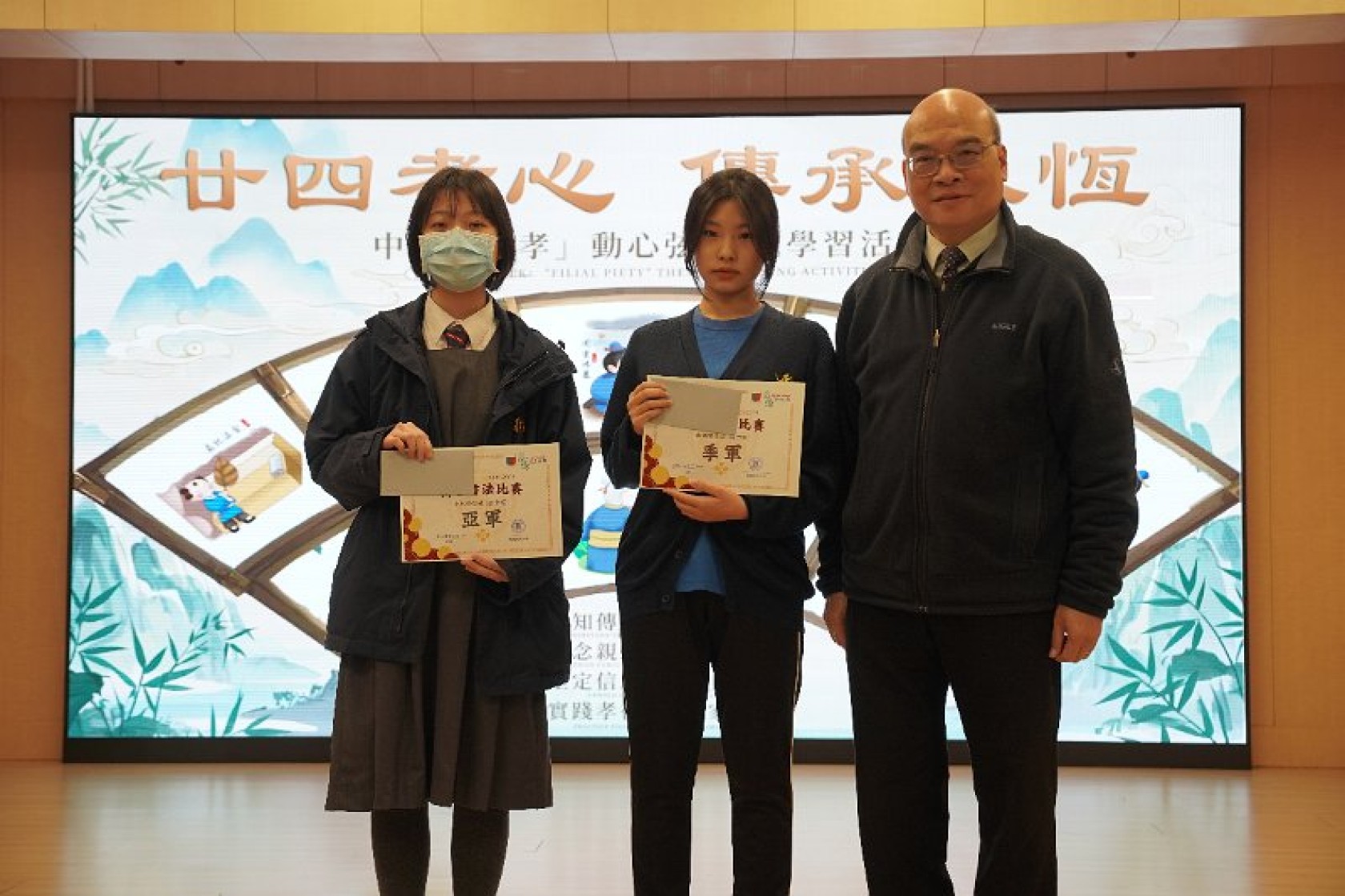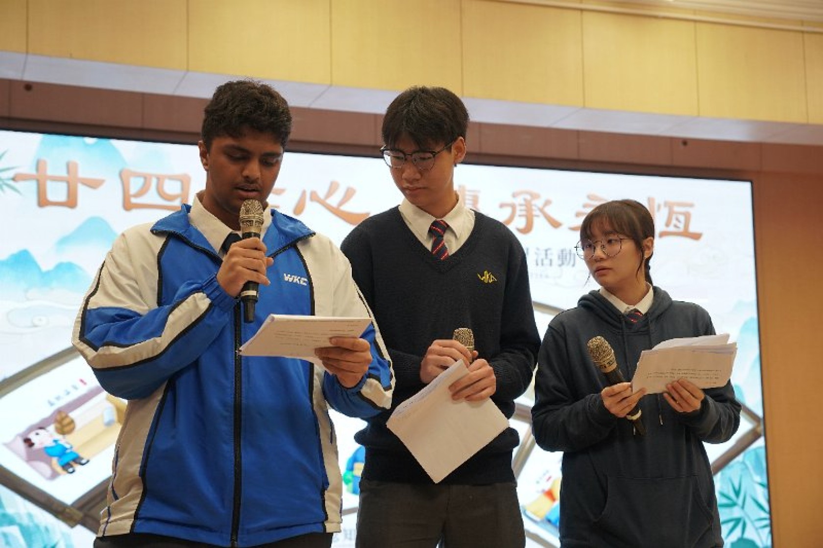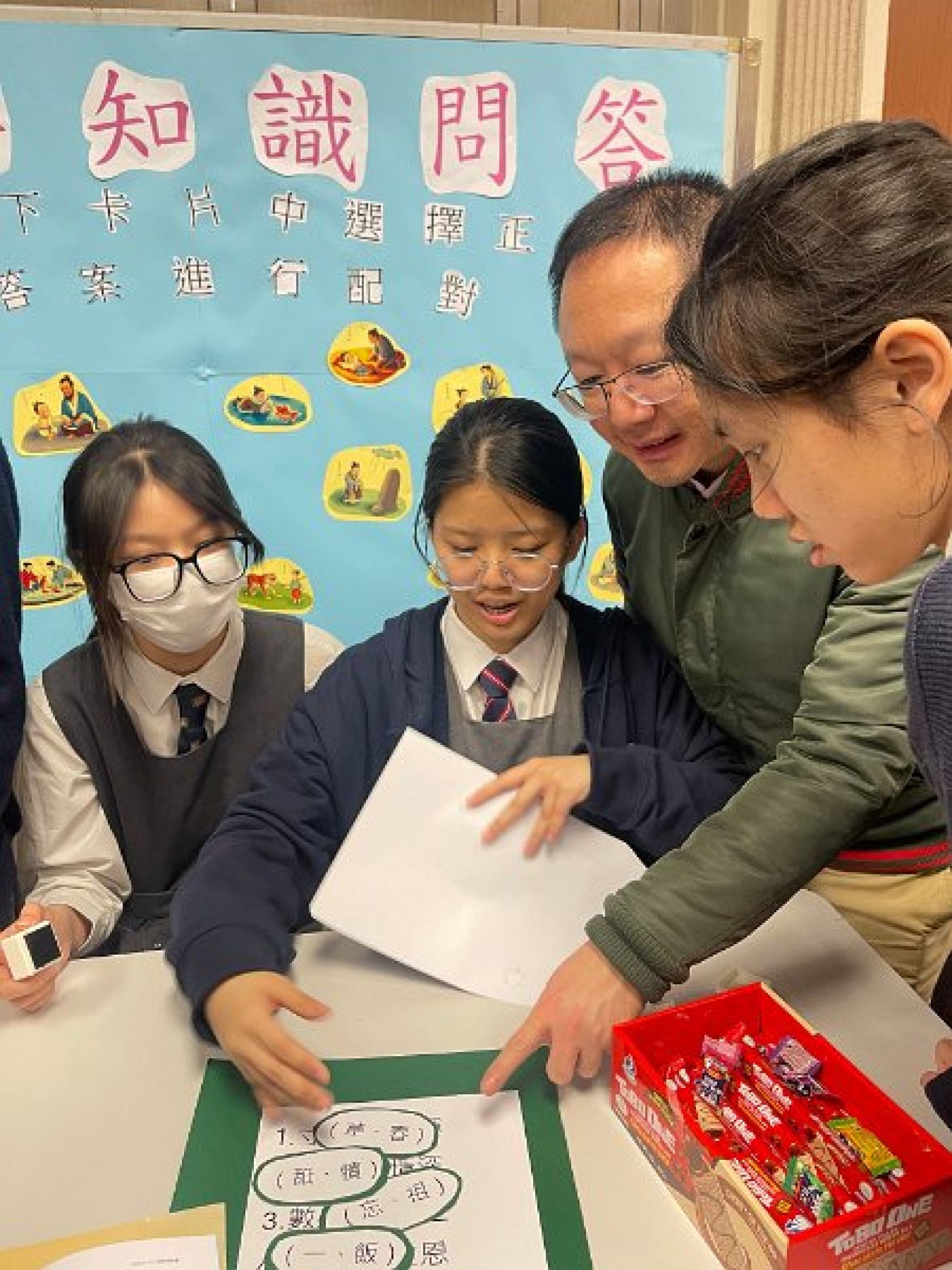 本年度中文週以「廿四孝心、傳承永恆」為主題,透過多元活動,深化學生對孝道價值觀的理解與實踐,並促進非華語學生與華語學生共融。課堂講授二十四孝故事,學生領略孝道文化精髓;「紙短情長」短詩創作比賽中,學生以詩寄情,字字珠璣,抒發對父母的感恩之心。週四午膳期間更舉行孝道文化知識攤位遊戲,例如「二十四孝故事對對碰」、「成語知識」、「孝言孝語大配對」,當中「結繫親恩」最受歡迎,學生親手編織中國結,贈予長輩,以物傳情,孝道精神內化於心。週五早會上,非華語中華文化大使分享巴基斯坦等國家的孝道精神,此外,大使們更自編自導自演,以生動的影片形式傳揚孝道,將傳統美德融入生活。活動中,非華語學生與華語學生共同參與,互相交流,增進理解,促進文化共融。活動豐富多彩,寓教於樂,學生於知、情、意、行四方面皆有所得,孝道價值觀深植心田,傳統文化薪火相傳,成效斐然。