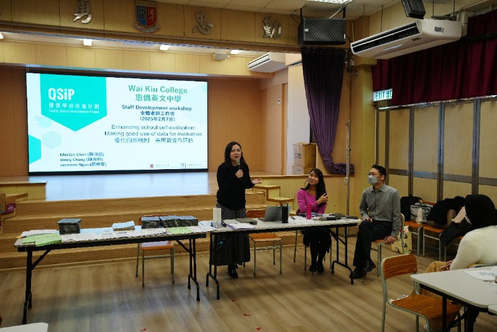 第二次教師發展日 日期:2025年2月7日 QSIP「優化學校自評計劃」2425 1. 全體教師工作坊「優化自評:善用數據作評估」 為全體教師介紹「優化學校發展與問責架構」,讓教師團隊建立共識,對優化架構下的學與教範疇及學生支援範疇的評估有更深的認識。此外,亦為教師團隊分析校本數據(如 APASO-III、持份者問卷),引導教師善用數據回饋學校發展。 2.中層教師工作坊:「科/組PIE:規劃、監察與支援」 為中層教師介紹「策劃—推行—評估 (PIE)」的理念及實踐策略,包括如何善用質性及量化數據,檢討工作成效,並制訂下一周期的計劃等原則和實用策略,包括科組報告及科組周年計劃的實例,引導中層教師以憑證為本撰寫科組檢討報告及周年計劃。 3.顧問會議 就學校擬定的學校發展計劃 (或周年計劃)初稿,提供顧問意見及優化建議;協助學校領導及行政主任以數據推動決策。