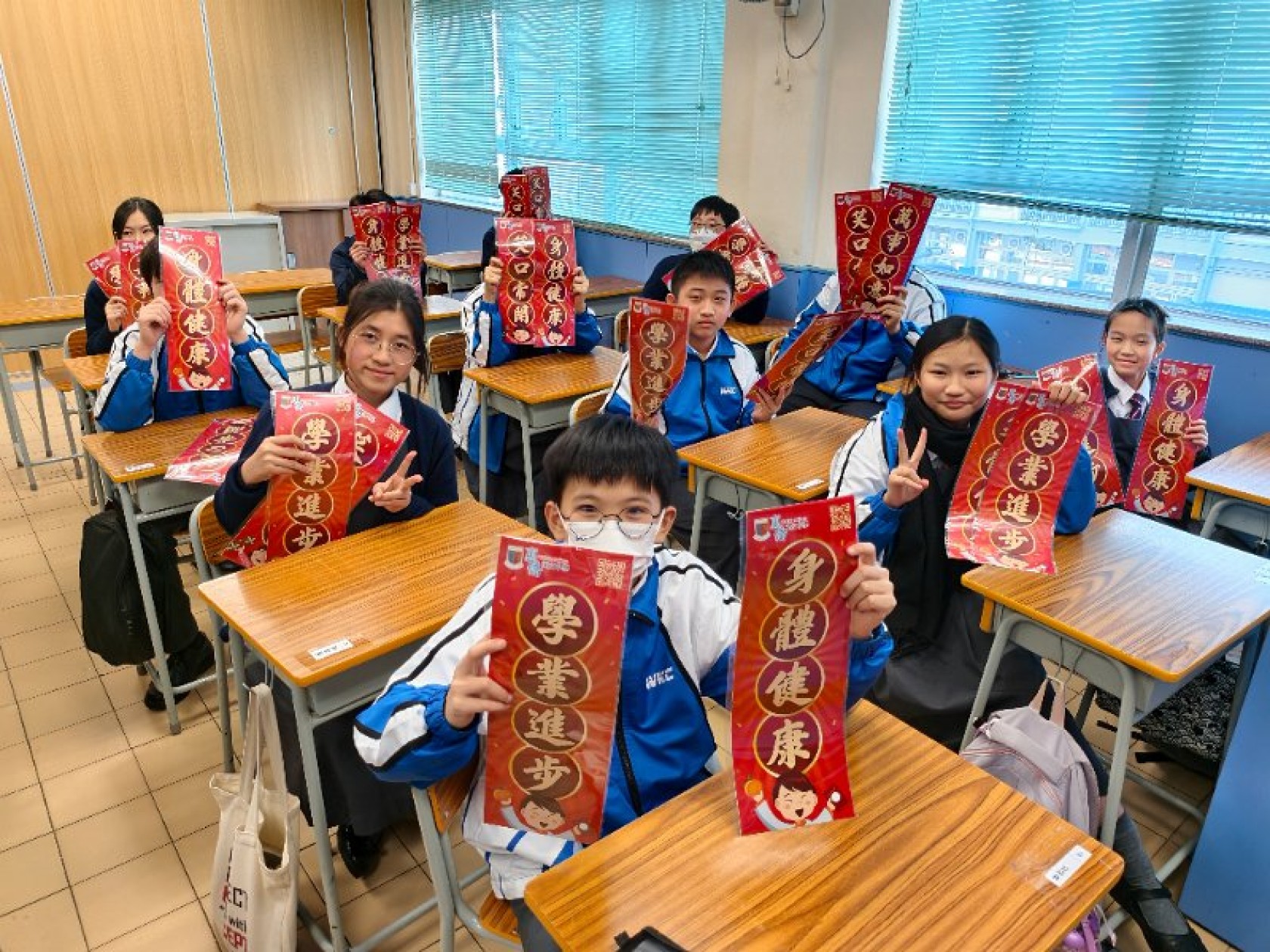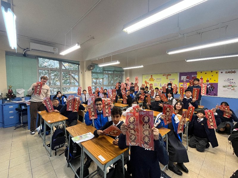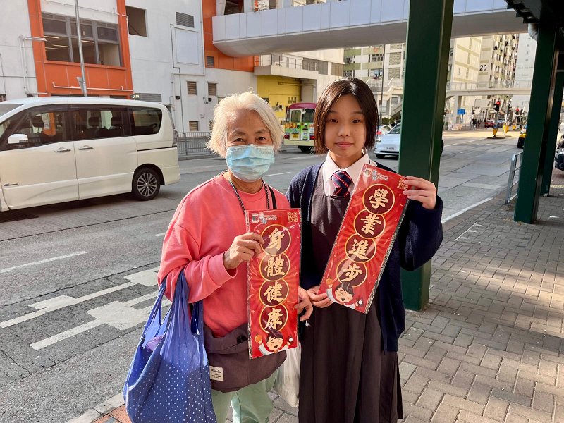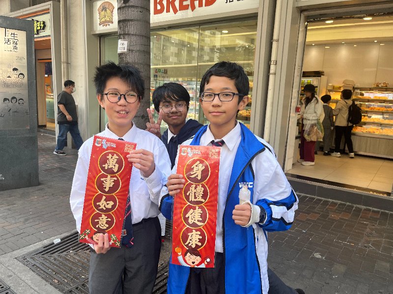 新春將至,為表我們對各街坊表達敬意,本校社會事務委員會主辦新年派揮春義工活動,活動於二零二五年一日廿日下午舉行,中一同學送上新年揮春送給本區內的居民。此活動也發揮學生服務社會的精神,使同學能建立自信心,令人生更健康積極。