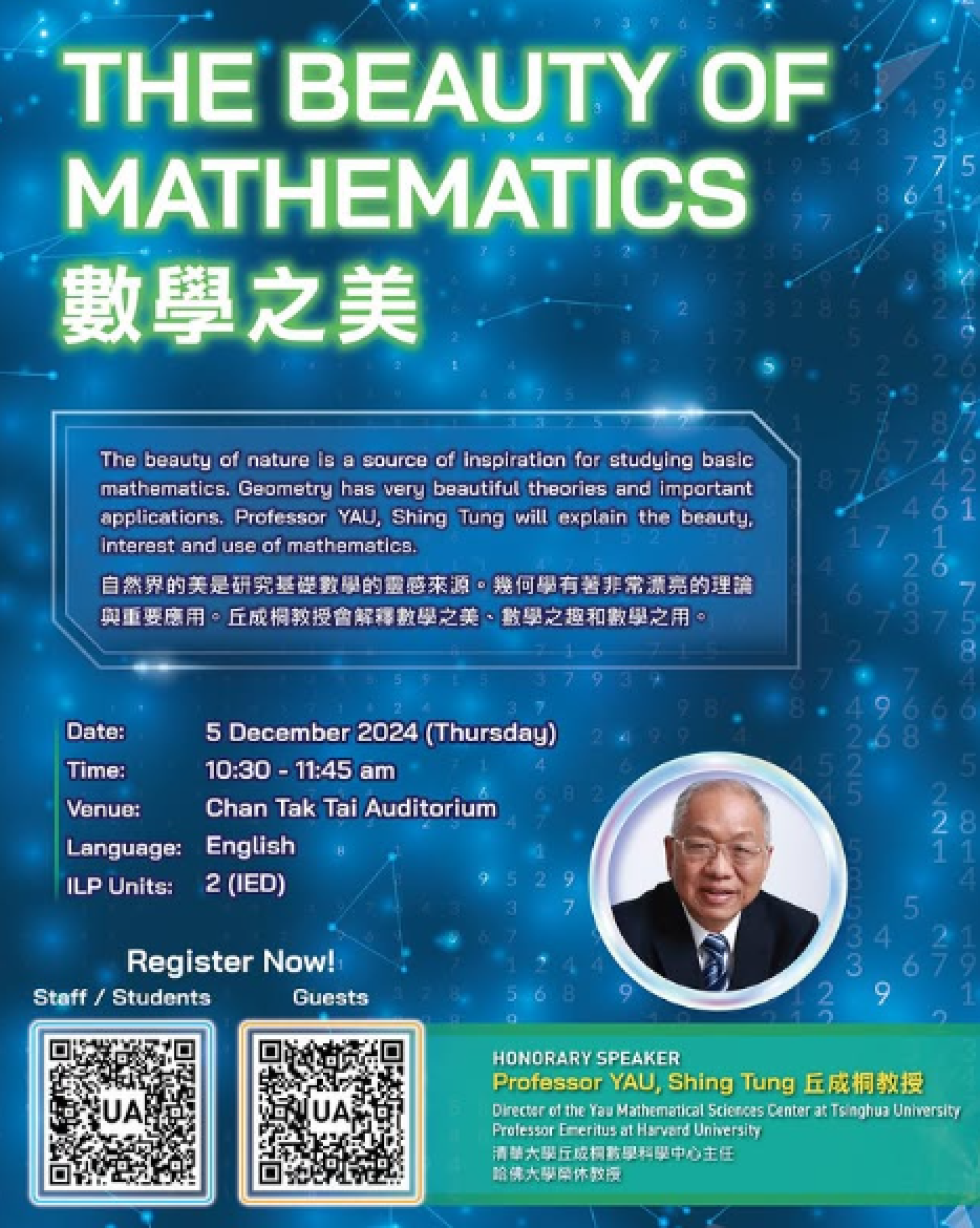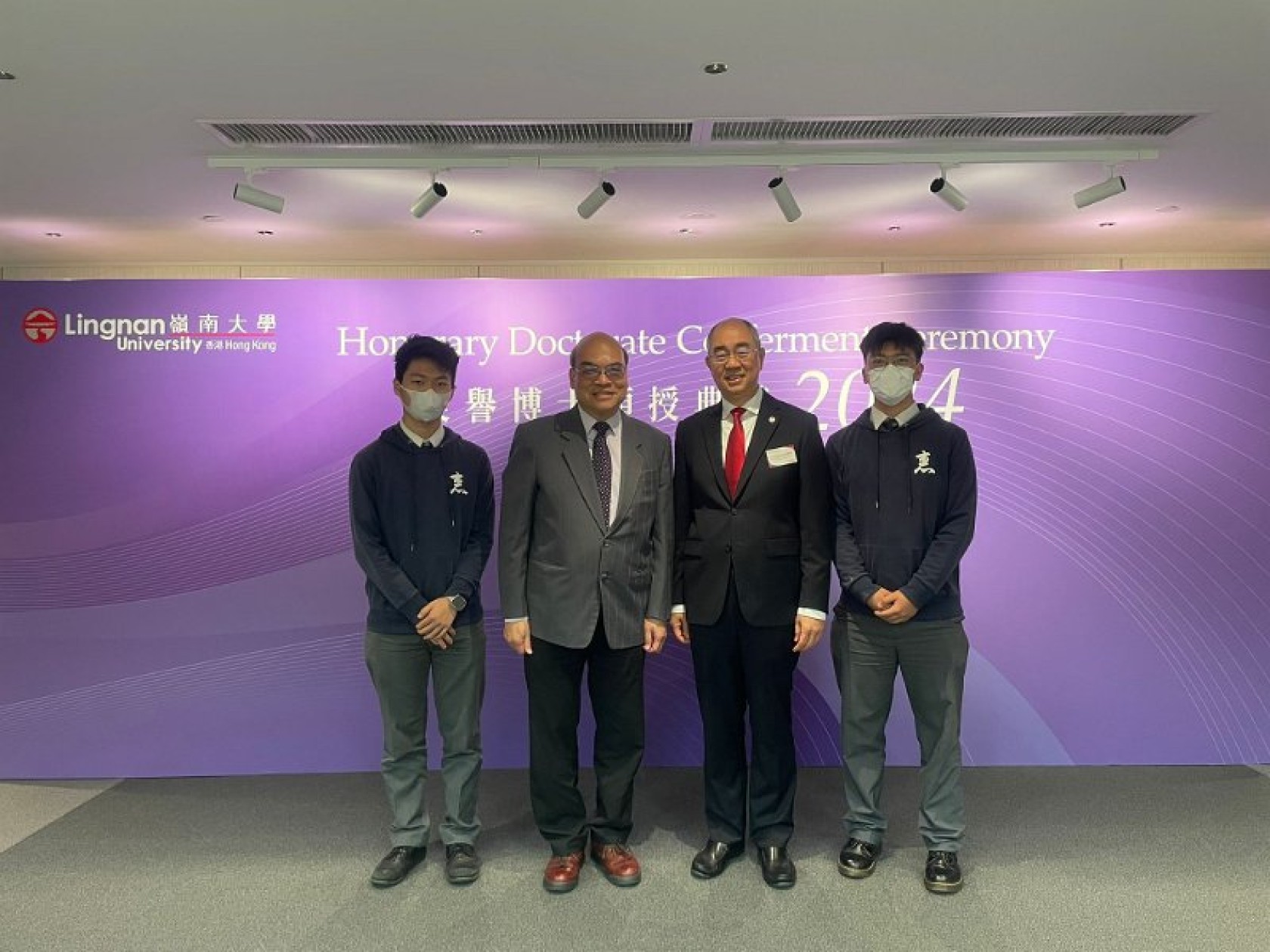 本校兩位同學出席了由丘成桐教授主講,題為「數學之美」的嶺南大學大學論壇 。丘成桐教授現任清華大學丘成桐數學科學中心主任,並為哈佛大學榮休教授。是次講座中,丘教授探討了自然界的美如何啟發基礎數學研究,並講解幾何學的優美理論及其在各領域的重要應用。曹校長及本校兩位同學與嶺大副校長國際著名數學家陳漢夫教授拍照留念。