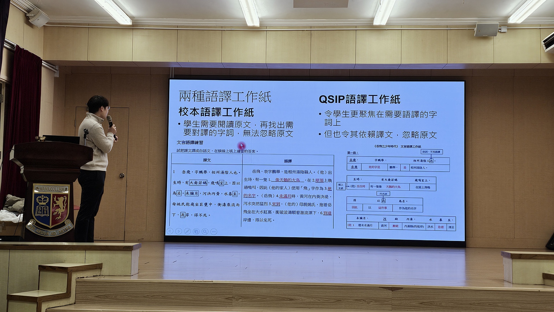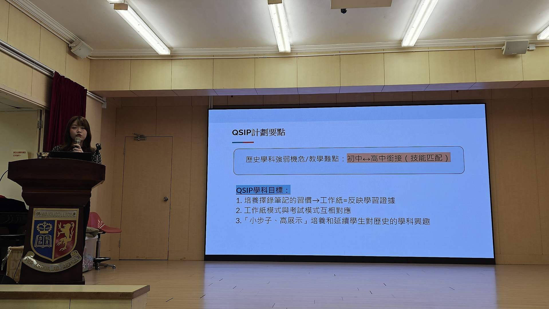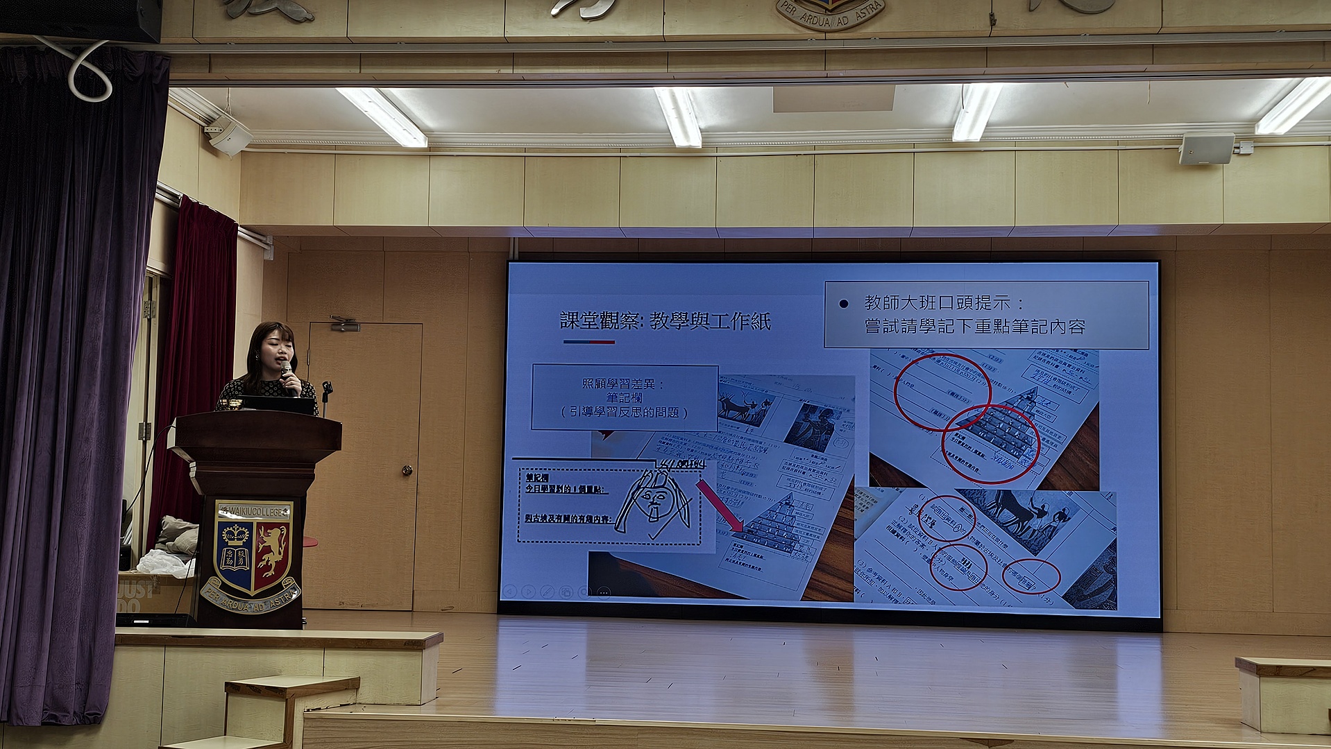 是次發展日分為兩部份。首先是優質學校改進計劃,透過「校本專業支援」推動學校繼續改進自主學習的製作筆記技巧。當中有中文、數學、歷史及科學科的分享,使不同範疇的老師均有所獲。之後就是第二部份,有關非華語學生的升學講座。承蒙教育局支持,香港明愛青少年及社區服務為多所學校的非華語中學生提供升學及就業輔導。當天,他們為我校教師作專業交流,簡介計劃內容及介紹非華語同學的升學路徑。